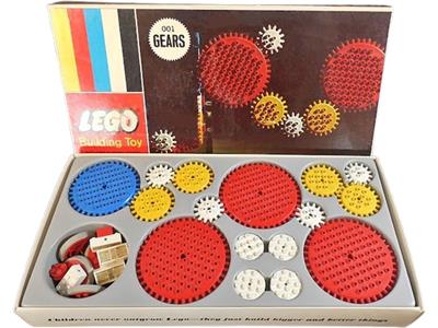 Vintage gear set. Very cool that set is number 001-1. Original parts, gears in great condition. White parts have discolored some with age. Rubber tires show darker wear color, but are still pliable. No original box, no instructions |
