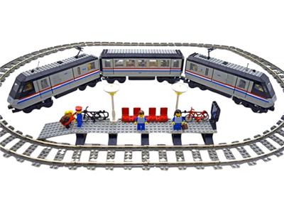 The iconic Metroliner train set returns, offering a stylish way to travel through your LEGO town. This classic set features a working engine, passenger wagon, and steering wagon, all with realistic detailing. A working train light illuminates as it moves along the 27 x 38-inch oval track. Included are 11 passengers, a rail stop platform, luggage cart, two bikes, and more. Requires the 9-volt Speed Regulator (sold separately) for operation.
