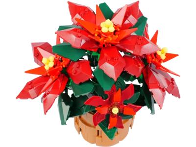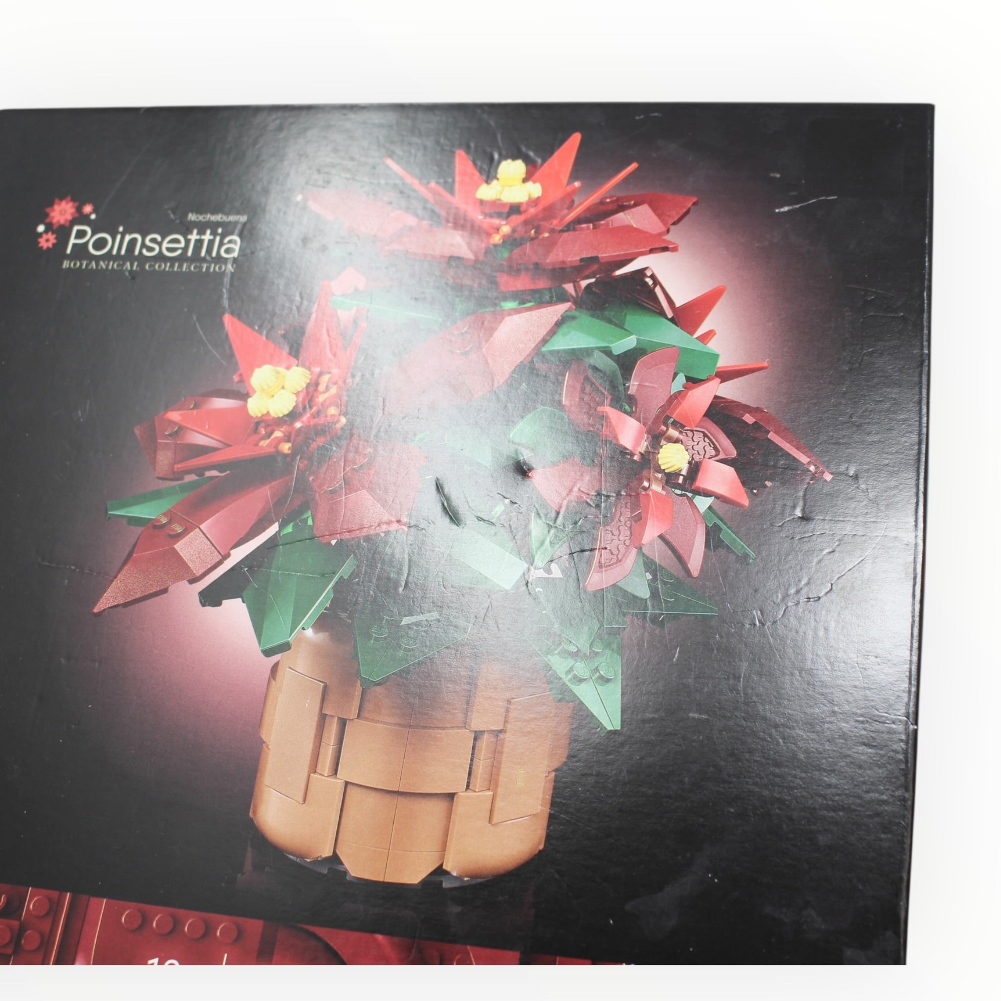 A stunning LEGO® Icons Poinsettia set for adults, offering a mindful building project and a timeless floral display perfect for gifting. This elegant replica features a 'Grande Italia' poinsettia in a woven-basket flowerpot, complete with green leaves and five clusters of vibrant red bracts with yellow centers. Easy to assemble, it provides a rewarding experience and creates a beautiful, zero-maintenance display for any home or office. Part of the LEGO Botanical Collection, it includes digital instructions via the LEGO Builder app. Please note: the box has superficial damage, but the seals remain intact.