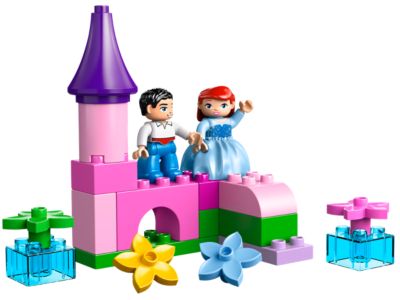 Plan a magical boat ride for Ariel and Prince Eric as they float past the pretty pink castle in a golden boat under the sunny sky! The set includes two LEGO DUPLO figures of Ariel in human form and Prince Eric, plus a castle, arch, golden boat, and a Sebastian-themed brick. Build and play with pastel-colored DUPLO bricks, transparent pieces, and flower decorations to recreate iconic scenes from the Disney animated movie. The castle stands over 7 inches high, the arch over 3 inches, and all pieces are safe and fun for younger hands.