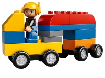 Start your day at the city construction site by setting up the road sign and traffic cone. It's a busy work zone where two workmen can drive the dump truck and operate the front loader. Use the tall crane to move bricks and build with the included plates and assorted DUPLO bricks. Load the dump truck, raise the front loader bucket, and enjoy safe, hands-on fun designed for younger builders.