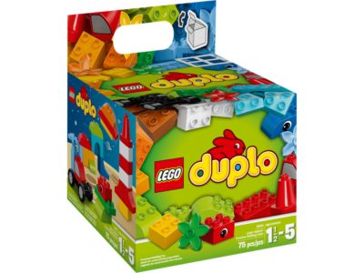 The LEGO DUPLO Creative Building Cube includes 75 colorful bricks and elements, featuring a wagon base, eye-decorated brick, window, fence, flowers, and classic pieces in bright primary colors. Young builders can create vehicles, trees, towers, and more, with building inspiration included to support first building adventures. The set encourages endless free-building fun and comes in a reusable storage box.