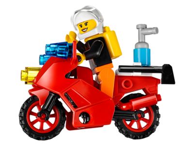 Prepare for LEGO City emergencies with this portable suitcase play set featuring a fire pickup truck with adjustable cherry picker, a motorcycle, and a buildable abandoned house with an opening door and windows. The fire pickup includes a rear storage compartment and a trailer for the cherry picker. Race to the scene, place a firefighter in the cherry picker, and raise it to extinguish the roof flames. Push the flame piece through the doorway to simulate a spreading fire. Designed for ages 4-7, this set includes two firefighter minifigures, Easy to Build models with larger pieces, and a simple guide for quick building and play.