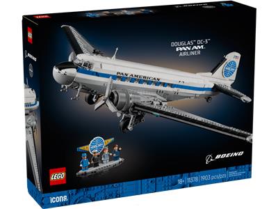 Celebrate aviation history with the LEGO® Icons Douglas™ DC-3™ PAN AM® Airliner (11378), a nostalgic airplane model kit for adults. This authentic replica of the legendary 1930s twin-engine aircraft features a detailed cockpit and passenger cabin, retractable landing gear, and a sleek exterior with the late 1950s Pan Am color scheme. Remove fuselage sections to explore the interior details and display the model aircraft on its stand, complete with an information plaque. The set also includes 4 minifigures with historical Pan Am aircrew uniforms, including a pilot, stewardess, flight attendant and purser, plus a Pan Am-branded minifigure display stand. This detailed vintage decor model makes a striking centerpiece for the home or office and a thoughtful gift for plane enthusiasts and fans of historical and retro decor. Build smarter with the LEGO® Builder app – zoom, rotate in 3D, track progress and follow step-by-step digital instructions. Set contains 1,903 pieces. The airplane model, including the display stand, measures over 9.5 in. (24 cm) high, 20 in. (51 cm) long, and 30 in. (76 cm) wide.