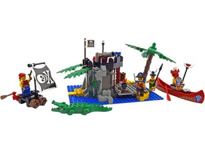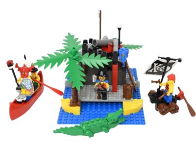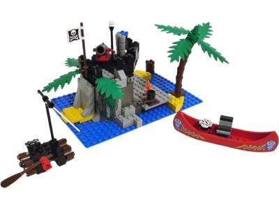 Complete set in good condition. Minifigures in very good condition. Big flag, baseplate, weapons and blue palm tree top in very good condition. Canoe stickers still good. No instructions. Shipped disassembled, pieces sorted by type. |