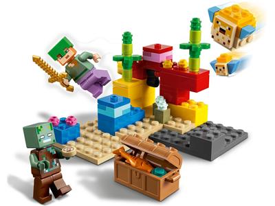 Bring Minecraft to life with the LEGO Minecraft The Coral Reef (21164), where kids join daredevil Alex on an underwater treasure hunt. This hands-on, reconfigurable set features a colourful coral reef, passing puffer fish, a surprise treasure chest, and an exciting sword battle against a drowned zombie. Includes Alex with diving helmet, magic pants, and sword, plus 2 puffer fish and accessories for endless creative play.