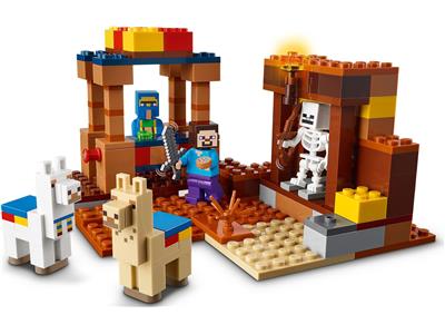 The Trading Post is a LEGO Minecraft set full of classic in-game features for imaginative play. It includes a mine with an exploding function, a mysterious trader, a hostile skeleton, and two llamas. Kids can help Steve mine resources, battle the skeleton, and turn a handle to reveal hidden trade items.