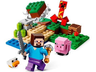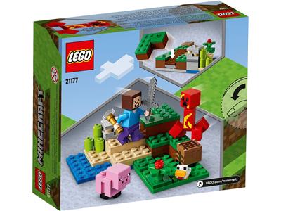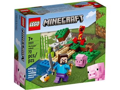 LEGO Minecraft The Creeper Ambush (21177) is a compact adventure set for kids aged 7 and up, featuring Steve, a baby pig, a baby chicken, and an Exploding Creeper. Players can craft iron ore at the workbench, care for the animals, grow sugarcane, and decorate with poppies before battling the Creeper using the detonation block to blast it into the air. After play, the set makes an appealing display piece for a child's room.