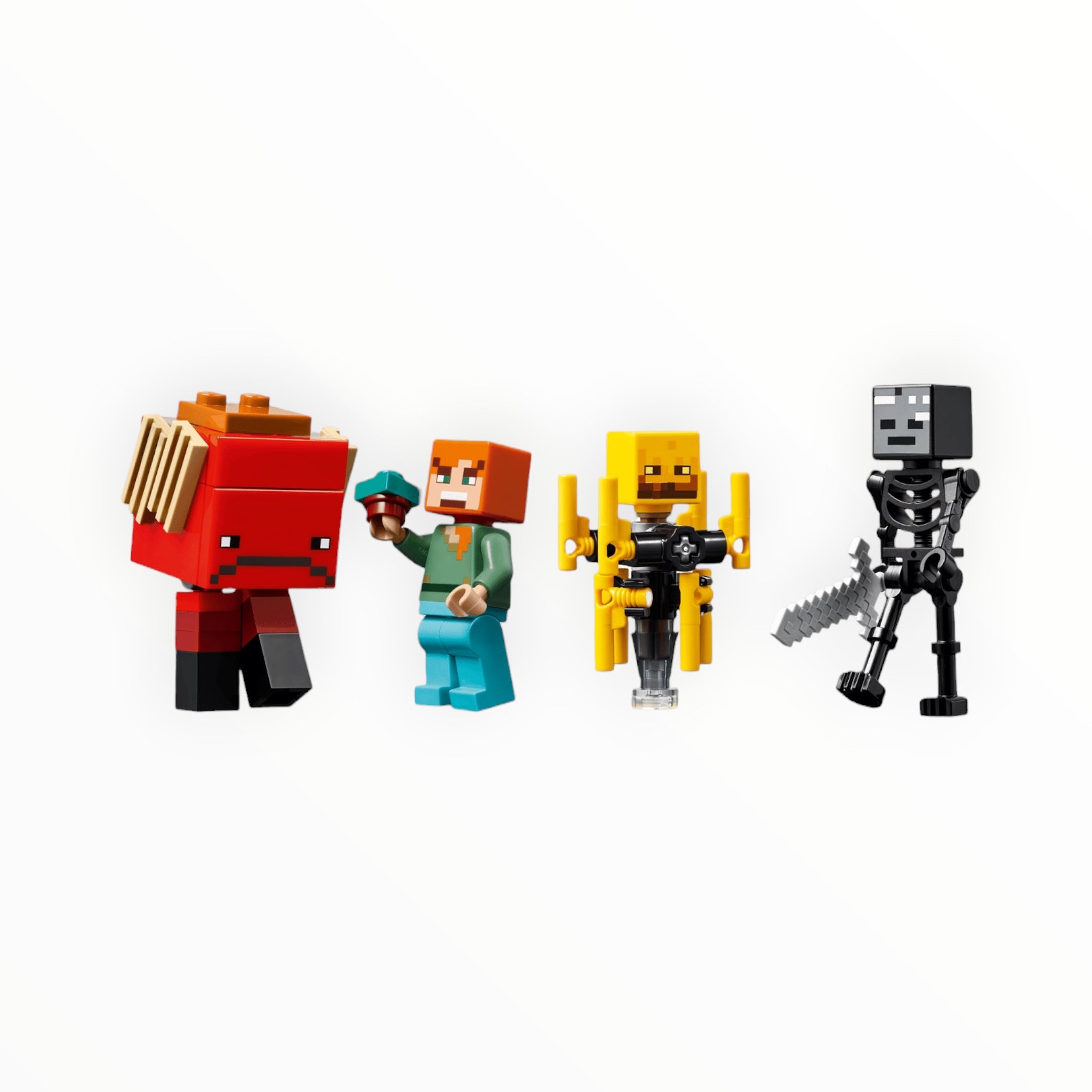 Join Alex in the Nether Lava Battle to clear ancient debris from a fortress bridge in the crimson forest. Trigger cascading lava flows and face off against a wither skeleton and a blaze blocking your escape. Wield a diamond sword to battle the mobs, then make your getaway on a posable strider, steering it with warped fungus. This LEGO Minecraft set brings the game's action to life with iconic characters and interactive features, perfect for endless imaginative play.