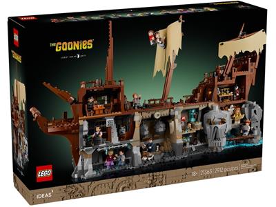 Relive the adventure of The Goonies with this LEGO Ideas diorama set for adults (21363). This collectible model brings iconic scenes from the cult classic to life, featuring brick-built vignettes of the Fratellis' hideaway, the treasure caves, and Willy's treasure room. Rotate the model to discover a detailed exterior of the Inferno pirate ship ruins. The set includes 12 minifigures of key characters, and the interiors are filled with authentic details and interactive features. Send a minifigure through the secret fireplace entrance, trigger the boulder-dropping trap, and use the Copper Bones Skeleton Key to release the trapdoor. Press the keys on the skeleton organ to break the floor and reveal the slide to the octopus (inspired by a deleted scene), or send Sloth sliding down the mast on the Inferno's deck. Perfect as a gift for movie lovers, this pirate ship-shaped diorama makes a striking piece of home decor. The set contains 2,912 pieces, offering a rewarding build and a nostalgic celebration of 1980s adventure.
