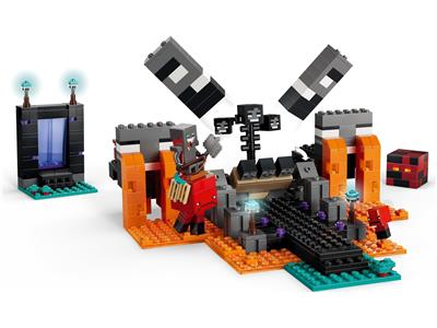 Minecraft players enter the warped forest with the Crimson Warrior to battle 2 wither skeletons, a strider, a magma cube, and a buildable wither boss. The set includes a Nether portal and a shrine with a crafting table and an explosion feature to summon the wither. Kids can ride the strider, fight enemies, and enjoy hands-on adventures. The set contains 494 pieces and supports Build Together mode in the LEGO Builder app for family and friends to join in.