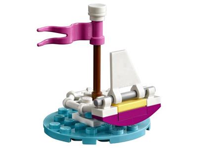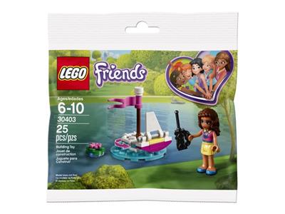 Olivia navigates her remote-control boat across the lake at Heartlake City Park, skillfully steering around the flagpole as it spins, guiding her vessel through the sparkling waters.