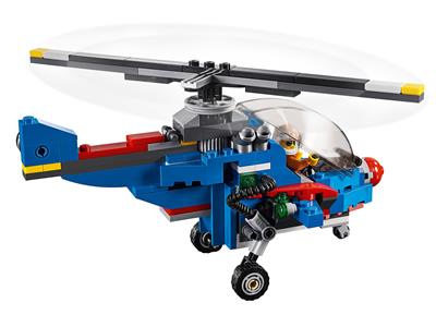 Construct a remarkable Race Plane, Helicopter, or Jet with this versatile LEGO® Creator 3in1 set. The classic Race Plane design showcases a vibrant blue, white, yellow, and red color scheme adorned with racing decals, a detailed engine with visible pipes and cylinders, fixed landing gear, a large propeller, sporty hinged wings, and adjustable tail elevators. The cockpit opens to seat the included pilot minifigure, dressed in a printed flight suit and helmet. This set offers three distinct building experiences: first assemble the Race Plane, then transform it into a powerful Helicopter or a speedy Jet with rotating thrusters for endless flying adventures.