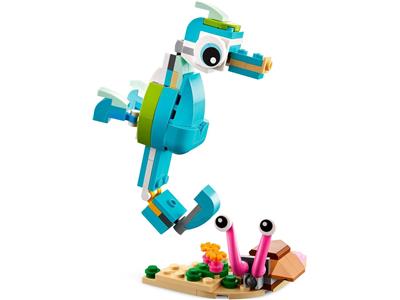 Dive into underwater adventures with this LEGO Creator 3in1 set, featuring a posable dolphin and turtle on a display stand. Rebuild into a seahorse with a sea snail or a fish with a crab for endless ocean play.