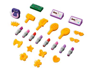 At the Butterfly Beauty Shop in Heartlake City, Emma and Sarah run a stylish salon where friends can shop for lipstick, makeup, and hair accessories. The set includes a fountain, bench, salon furniture, and accessories like bows, sunglasses, a hair dryer, hairbrush, mirror, purse, and a money brick. Kids can rearrange the interior and get the mini-doll figures ready for any event.