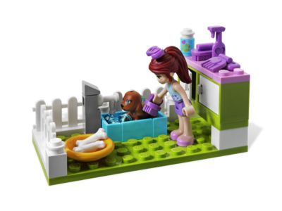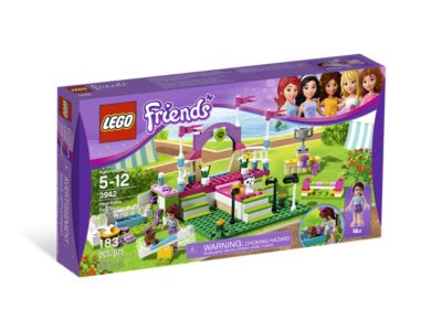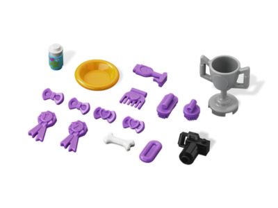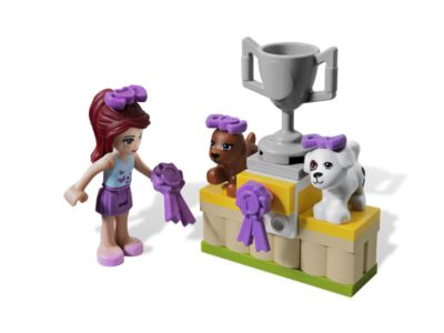 Join Mia at the annual Heartlake Dog Show! Help her prepare Scarlett and Jacky for the big event. Start by washing and grooming the puppies in the special grooming area, then show them off on the podium and runway to impress the judges. Guide the puppies through the fun obstacle course, complete with a seesaw and hurdle, to try and win the trophy. The set includes Mia, her two puppies, a detailed show area with a runway and preparation station, two obstacles, a trophy with a stand, and fun accessories like a camera, bows, brushes, bones, flowers, and flags. Celebrate a prize-winning day with LEGO Friends!