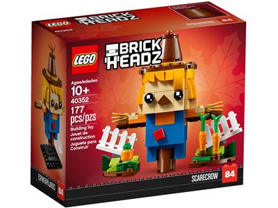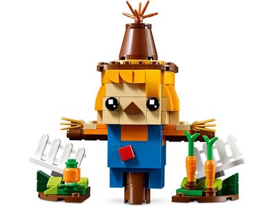 Celebrate Thanksgiving with a colorful LEGO BrickHeadz scarecrow, featuring a charming buildable scarecrow and a countryside scene with carrots, pumpkin, and picket fence details. Measures over 5 inches high.