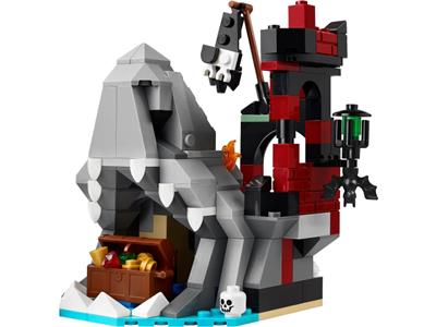 Embark on a spooky Halloween adventure with the LEGO® Creator Scary Pirate Island (40597). This 214-piece set brings a haunted island to life, featuring a shark's head with a hidden cave inside its menacing jaws and a mysterious castle ruin complete with a staircase. Discover hidden treasures like a chest overflowing with gold and jewelry, a creepy skull, and a bat. A daring pirate minifigure paddles toward the island on a raft, armed with a sword and oar, ready to explore. Perfect for kids aged 8 and up, this buildable set is ideal for imaginative play and makes a thrilling Halloween gift. Its compact size—over 5 inches high, 4.5 inches wide, and 3.5 inches deep—allows for easy play at home or on the go.