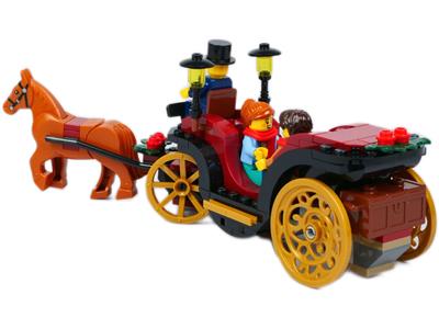 Experience the magic of the season with the LEGO Wintertime Carriage Ride (40603). This festive set features a beautifully detailed carriage with a dark red interior, golden wheels, and a rear storage trunk. Included are a driver, two passenger minifigures, and a horse figure. The carriage measures over 3 inches high, 9 inches long, and 2.5 inches wide, making it a charming addition to any holiday display.