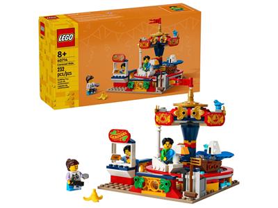 The LEGO Carousel Ride is an exciting amusement park building set designed for kids aged 8 and up. This vibrant, detailed carousel features four unique carts—a swan, a whale, a fire truck, and a boat—that rotate by turning a pedal gear in the base. The set includes three minifigures: a ticket seller, a boy with an ice cream, and a girl with a camera, all ready to enjoy the ride. Packed with fun accessories like a ticket booth, ticket, banana peel, blue bird, red flag, lamppost, trash can, and brush, this playset encourages imaginative storytelling and hands-on building fun.
