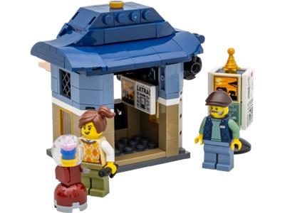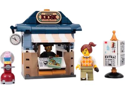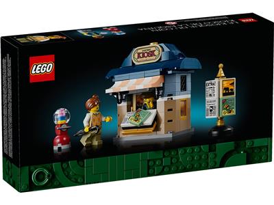 Step into the nostalgic charm of a bygone era with this LEGO Icons set for adults. Craft a vintage corner kiosk featuring a striped awning, a newsstand, and a quaint public clock. This charming mini-addition to the LEGO Modular Buildings Collection includes a classic display pillar and a gumball machine, along with a vendor minifigure and a customer minifigure holding a closed black umbrella. Recreate the bustling vibe of historic street corners with this enjoyable building project. The detailed model comes with a removable roof for interior access, allowing you to fully appreciate the intricate design of this old-fashioned kiosk.