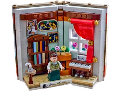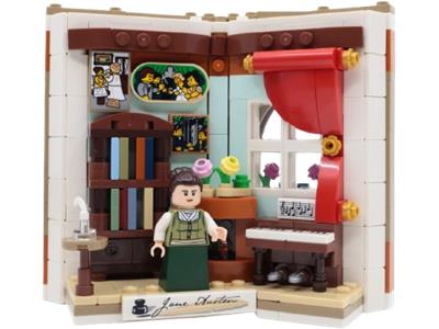 This detailed LEGO® display model pays tribute to the illustrious author Jane Austen, created in celebration of International Women’s Day. The set features a Jane Austen minifigure within a charming, book-shaped diorama of her home. The scene includes a cozy fireplace, a small writing table with a quill, a piano with sheet music, a bookshelf, flowers, and wall paintings depicting scenes from film adaptations of her beloved novels. A nameplate is mounted on the sturdy base. Designed for fans aged 12 and over, this collectible model is a perfect display piece to honor the author's legacy every day.