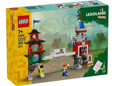 LEGOLAND Park Portal (40810) captures the iconic entrance to LEGOLAND resorts in miniature form, complete with the signature LEGOLAND sign. The set showcases two distinct towers: one in blue and gray with Chinese architectural details, and the other in red and black with a classic castle aesthetic. It comes with branding stickers and an exclusive "I Love LEGOLAND" minifigure featuring the updated brick-heart logo.