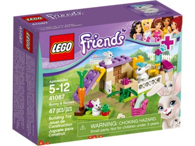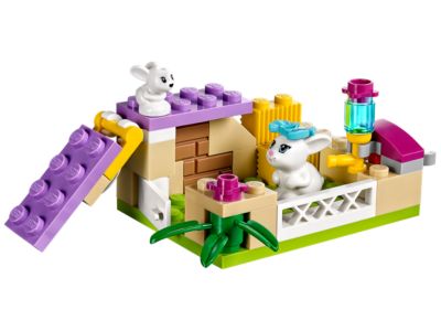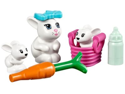 Play with a mother bunny and her two newborn babies in the garden. Help feed them from a bottle and give them carrots and radishes from the vegetable patch. Build an enclosure with a liftable ramp, opening gate, and hiding spot, then place them in a basket when it's time to go home. Includes the mom bunny, 2 baby bunnies, water dispenser, carrot, radish, feeding bottle, hair bow, and basket.