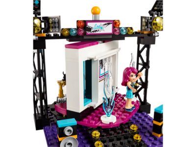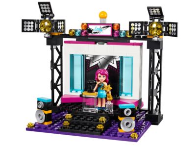 Shoot music videos at the LEGO Friends Pop Star TV Studio with the film camera and clapper board. Slide different backgrounds and use various props to create the perfect set, then reverse the stage for Livi's awards ceremony acceptance speech. Includes a Livi mini-doll figure, buildable film camera, adjustable spotlights, speakers, monitor, microphone, clapper board, two water jets, and an award. The reversible set features a music video side with changing backgrounds and an awards ceremony side. The TV Studio measures over 5 inches high, 5 inches wide, and 5 inches deep, with 194 bricks, offering an age-appropriate building experience for ages 6-12.