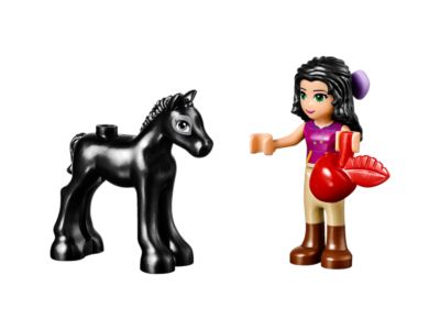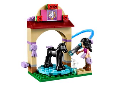Care for Emma's pet foal with the LEGO® Friends Foal's Washing Station. This set includes an Emma mini-doll figure in jodhpurs and a black foal. The washing station features a turntable and a flexible hose for a thorough clean, plus a display table for grooming products and a feeding area with a storage crate. Accessories like a bucket, grooming brushes, spray bottle, horse soap bottles, hair decorations, an apple, and a carrot allow for complete care. Lead the foal onto the turntable and rotate it to groom every side, then use the hose and shampoo for a sparkling wash. Designed for ages 5-10, the Horse Washing Station measures over 3” (9cm) high, 2” (6cm) wide, and 2” (6cm) deep.