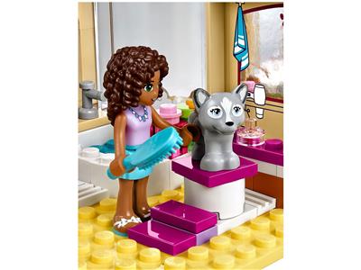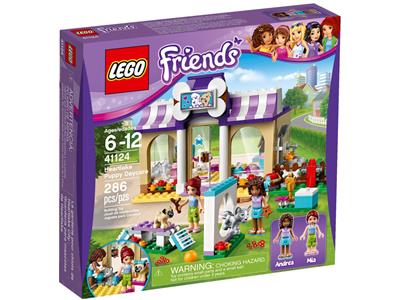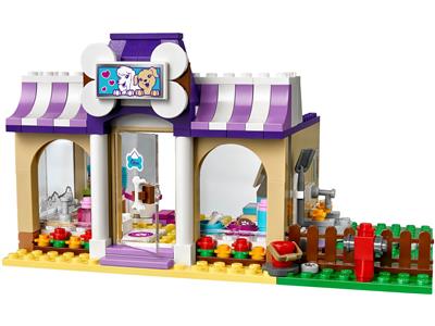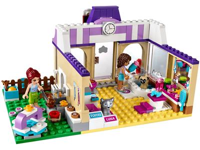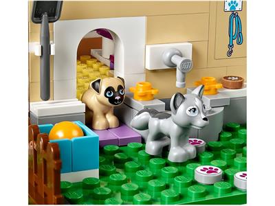Look after playful pups with Andrea and Mia at the LEGO Friends Heartlake Puppy Daycare. Outside, the dog park features an agility course with obstacles, a working roundabout, and a podium. Inside, find a bath, grooming station, feeding area with dog beds, and an office space. The set includes two mini-doll figures, a Husky, and a Pug, plus lots of pet toys and accessories. The daycare measures over 3 inches high, 7 inches wide, and 4 inches deep.