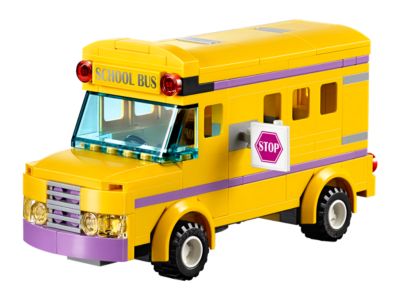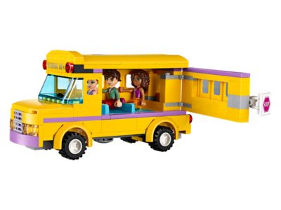 Travel to the LEGO® Friends Heartlake Performance School in the iconic yellow school bus, featuring opening doors and a removable roof. Store school supplies in the opening lockers before exploring the three-story modular building. The first floor includes an entrance hall, a locker room with a bench, and a canteen with a counter, table, and stools. On the second floor, find a classroom with a whiteboard and desks, a film editing suite with a computer and video camera, and a bathroom. The top floor houses a performance studio with a piano and removable musical instruments, which can be cleared to create a stage. Outside, a viewing bench with a rotating speaker completes the scene. This set includes three mini-doll figures: Andrea, Noah, and their dance teacher, Iva.