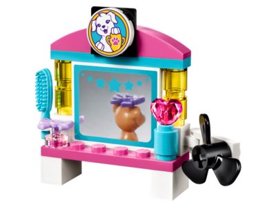 Get puppy Lara ready for her big dog show debut with LEGO® Friends Puppy Pampering. Groom her all day long with a bubble bath, vanity featuring a mirror and fan, and a dog bowl with a juicy bone. Includes a Lara the dog figure, brush, perfume bottle, shampoo bottle, and more. Splash in the bath, use the shampoo to make her coat shine, and sit her in front of the mirror with the fan and grooming tools. The vanity measures over 2 inches high, 3 inches wide, and 1 inch deep. The bath measures over 1 inch high and under 1 inch wide and deep. Combine with the Puppy Championship to take Lara to the dog show. For ages 5 and up.