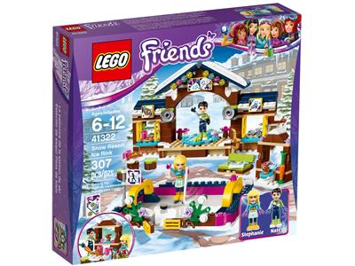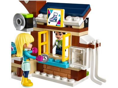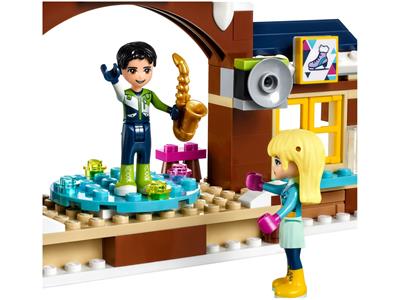 Experience the thrill of winter fun at the LEGO® Friends Snow Resort Ice Rink. This outdoor rink features opening doors, removable hockey goals, and a cozy seating area. Perform on the revolving stage at the skating lodge, rent hockey and skating gear, and enjoy a treat from the pretzel shop. Discover a friendly bunny living in a nearby tree. The set includes Stephanie and Nate mini-doll figures in ice-skating outfits, plus Moka the bunny. Accessories like ice skates, hockey sticks, a puck, saxophone, microphone, mugs, pretzel, croissant, and a carrot bring the scene to life. Open the rink doors for skating fun, share a pretzel with friends, and meet the adorable bunny. Add the hockey goals for exciting gameplay.