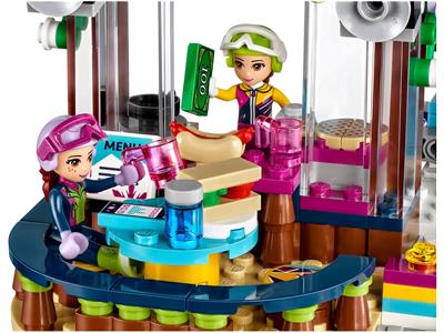 The LEGO Friends Snow Resort Ski Lift offers a complete winter adventure with a working ski lift, sliding ski slope, mountaintop restaurant, rock climbing wall, ski rental stand, trail map, and a special slope and cave for the bear cub. Includes two mini-doll figures, Mia and Olivia in skiing outfits, plus a bear cub named Biscuit. Accessories include a snowboard, skis, ski poles, binoculars, pie, sandwich, hot dog, cup, menu, and map.