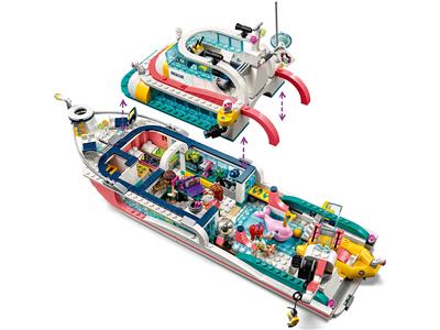 Embark on a thrilling ocean rescue mission with the LEGO® Friends animal clinic boat. This fully equipped vessel features a speedboat with launching function, a swiveling crane and stretcher for animal transport, a lookout post, and a detailed cockpit. The removable deck reveals a cabin complete with a lab, kitchen, bedroom, and toilet. Discover a separate heart-shaped island hiding a water-reactive map that leads to underwater treasure. Enhance the building experience with Instructions PLUS in the LEGO Life app, offering interactive, zoomable, and rotatable 3D guidance for a seamless creative journey.
