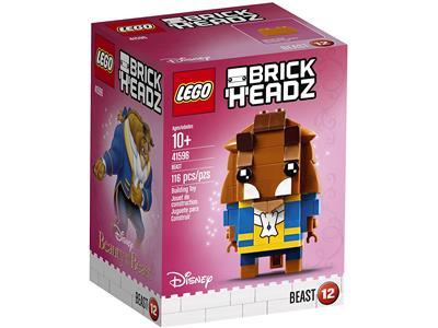 Buildable LEGO BrickHeadz figure of Beast from Disney's Beauty and the Beast, featuring a decorated waistcoat, mane, and horns on a collector's display baseplate.