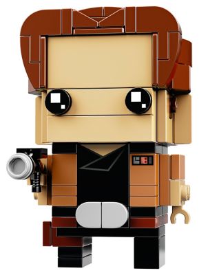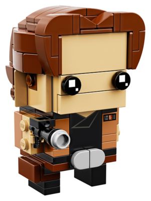 Buildable LEGO BrickHeadz character of Han Solo with iconic brown jacket and utility belt, includes detachable blaster and collector's baseplate with BrickHeadz logo; stands over 2 inches tall.