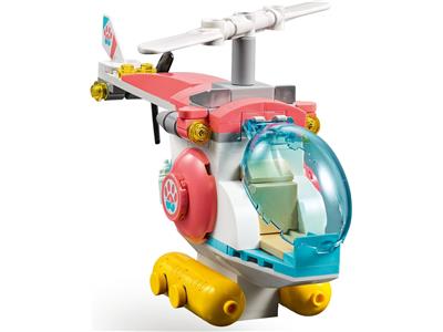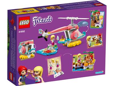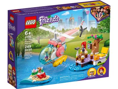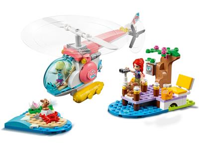 The LEGO Friends Vet Clinic Rescue Helicopter (41692) toy lets kids join Stephanie and Mia on a mission to rescue a stranded bunny from a heart-shaped island. This animal playset includes a colorful helicopter with spinning rotors, a hinged tailgate, and vet tools like a stretcher and syringe, plus a lakeside jetty and picnic scene for imaginative play.