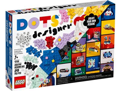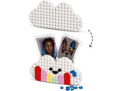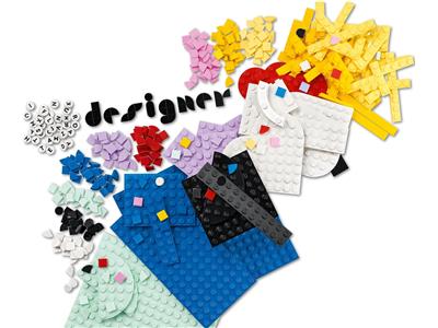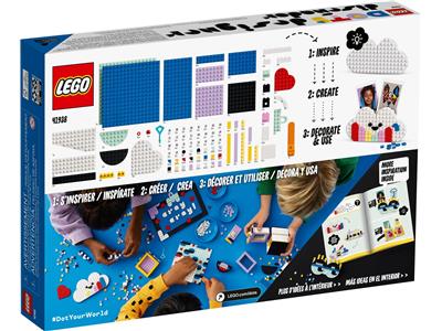 This creative LEGO DOTS set includes a desk organizer, 2-level standing drawers, hanging message board, picture frame, and small tray, plus a magazine with design ideas and tile options for personalized room decor.