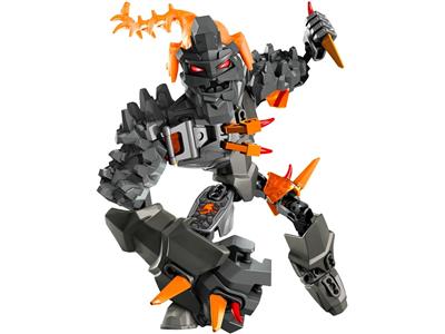 The evil brains have turned a rock giant into BRUIZER, a wild-eyed monster with a swinging rock-smasher fist, rock shoulder armor, and razor spikes. This stone-faced beast is ready for battle. The set includes a removable orange evil brain, swing action arm, and highly poseable design with rock-decorated armor. Attach the evil brain to complete the transformation. Combine with 44004 BULK using instructions at LEGO.com/herofactory.