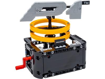 This LEGO Technic set recreates the McLaren P1 logo, built entirely from bricks. The iconic “P1” design is mounted on a sleek black box. A hand crank on the side allows you to rotate the logo, bringing a dynamic, mechanical element to this display piece.