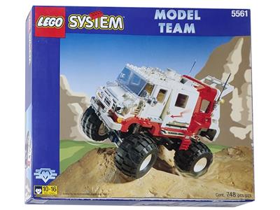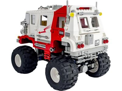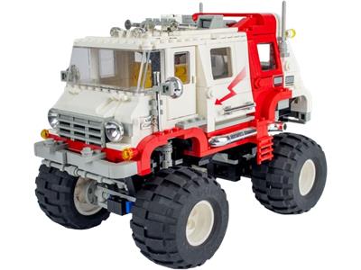 This rugged LEGO SYSTEM Big Foot vehicle features functional doors that open, adjustable seats, and movable wing mirrors for added realism. The cab includes a steering element on top for easy control. Designed for builders aged 10 and up.