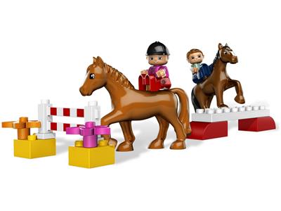 LEGO Duplo 10524 The Horse Stable features a colorful farm setting with a jumping competition, including a 2-horse stable, truck and horse trailer, Dad and daughter figures, 2 horses, and an arena. The stable measures over 10 inches long and 7 inches tall, while the truck is 5 inches long and 3 inches tall. Winner of the 2010 Parents' Choice Recommended award.