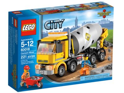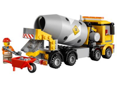Build the foundation of a LEGO City worksite with the cement mixer truck! Drive it into place, rotate the drum, direct the chute, and pour the cement before it sets. Includes driver and construction worker minifigures, plus shovel, wheelbarrow, coffee cup, and 18 cement-colored bricks. Features a rotating drum, movable chute, and tipping cab. Measures over 3" high, 7" long, and 2" wide.