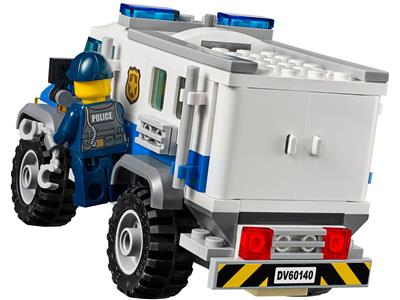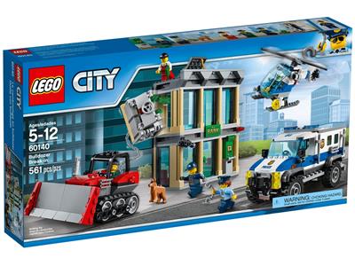 Help the LEGO City police protect the bank from crooks trying to steal the safe and ATM with a bulldozer. This set includes a bank building with a pull-out safe and ATM, a waiting area, a barred security gate, a drainpipe, a rooftop trapdoor, and a teller's desk. The police truck has opening rear doors and comes with accessories, while the helicopter features a searchlight and spinning rotors. The crooks' bulldozer has chains and hooks. Also includes five minifigures—police officer, pilot, police specialist, two crooks—and a police dog figure.