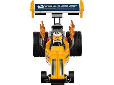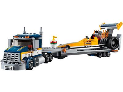 Race for the fastest time with the LEGO® City Dragster Transporter! This action-packed set includes a powerful transporter truck with a detachable trailer and a sleek dragster featuring an extended wing and engine flames. Load the dragster onto the trailer using the lowering ramp, hitch it to the truck, and tow it to the track. Fuel up with the included barrel, then start the race with the buildable light signal. The set comes with two minifigures: a truck driver and a dragster driver, plus accessory tools and a mug. Designed for ages 5-12, it offers an exciting build and play experience.