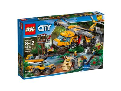 The Jungle Air Drop Helicopter from LEGO City comes with two spinning rotors and a clamp system for carrying supplies. It includes a work tower with a rotating crane, a riverboat that can hold pallets or motorbikes, a temple with a collapsible bridge and movable statue, and a buildable Venus flytrap. Also features a 4x4 truck with a winch, and comes with 7 minifigures including a riverboat captain and helicopter pilot, plus tiger, crocodile, and 2 spider figures.