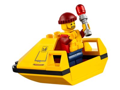 Fly in and save the stranded sailor before he floats away! Join the brave crew of the LEGO City coast guard aboard the Sea Rescue Plane, featuring spinning propellers, an opening cockpit, a lowering back ramp, and space for the included rescue water scooter and rescue raft with a rescue light. This set includes two minifigures: a rescue plane pilot and a sailor. The plane has spinning rotors, pontoons, an opening minifigure cockpit, and a back ramp that lowers to reveal space inside for the 2-minifigure water scooter. Spin the rotors to take off, search for the missing sailor, and use the rescue light from the raft to signal the pilot. Land the plane, lower the back hatch, and hop on the water scooter to rescue the stranded sailor. Includes a rescue light accessory element. Rescue plane measures over 3 inches (8cm) high, 8 inches (21cm) long, and includes a rescue raft.