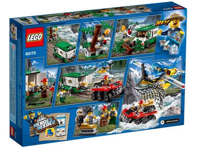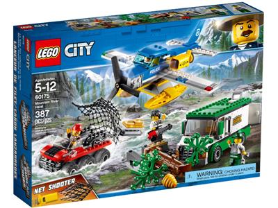 Keep the crooks from escaping with the gold bars! Pick up your badge and join the LEGO City Mountain Police as they investigate the Mountain River Heist. This toy set includes a police seaplane with a spinning propeller, opening cockpit, and an aimable net shooter, an armored truck with space for a pallet, a small amphibious vehicle with chain and hook, and a falling tree with beehive. Use the tree to stop the money transport, hook the chain to steal golden plates and bars, spin the propeller to take off in the seaplane, and push the lever to fire the net at the crooks. Includes 4 minifigures: a police pilot, security officer, and two crooks.